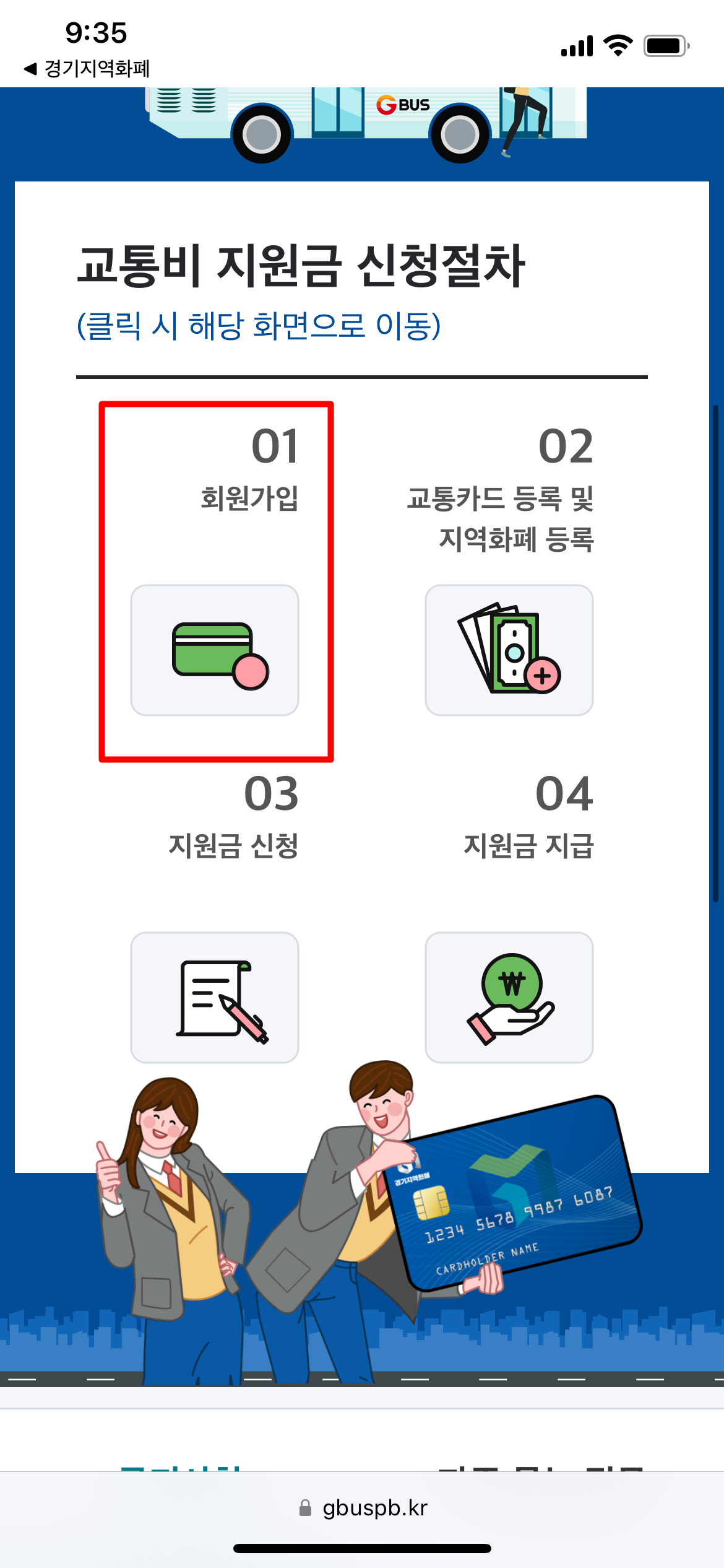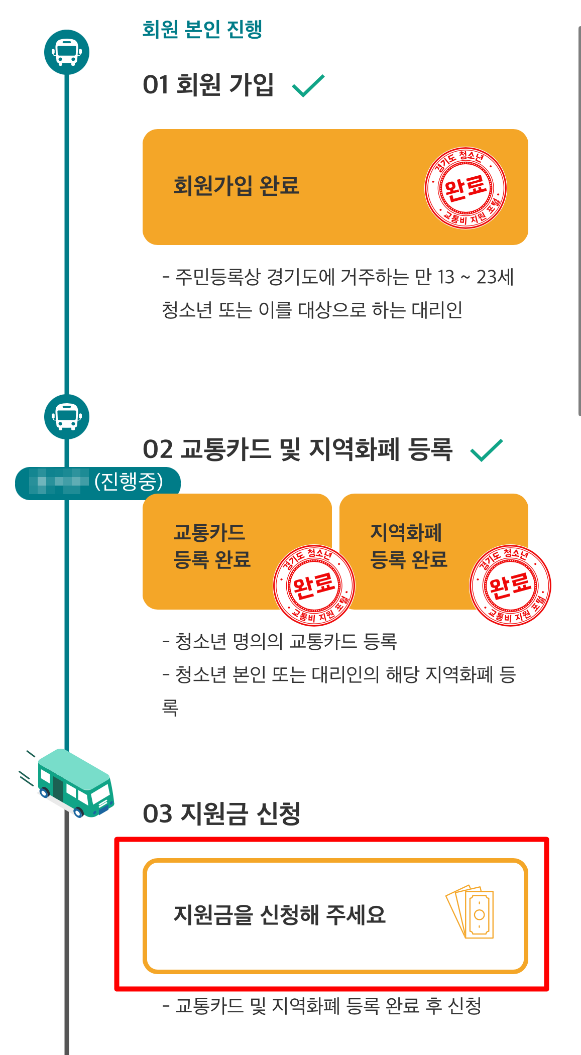 순서는 회원가입 -> 교통카드 등록 및 지역화폐 등록 -> 지원금 신청 -> 지원급 지급입니다.