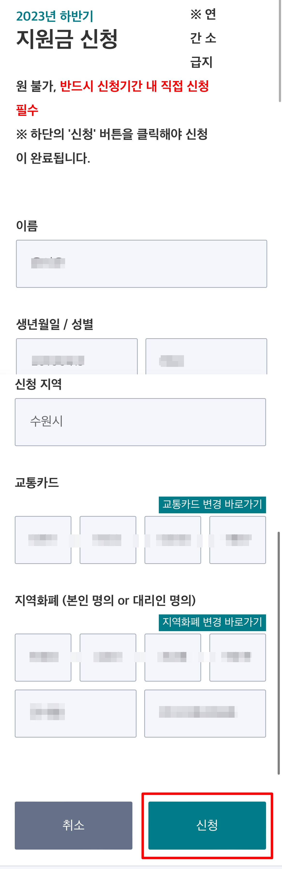 회원 가입과 교통카드 및 지역화폐 번호 등록이 좀 까다롭지만 한번 등록해 두면 저장이 되니 적은 금액이더라도 가입하셔서 꼭 지원받으셨으면 좋겠습니다.
