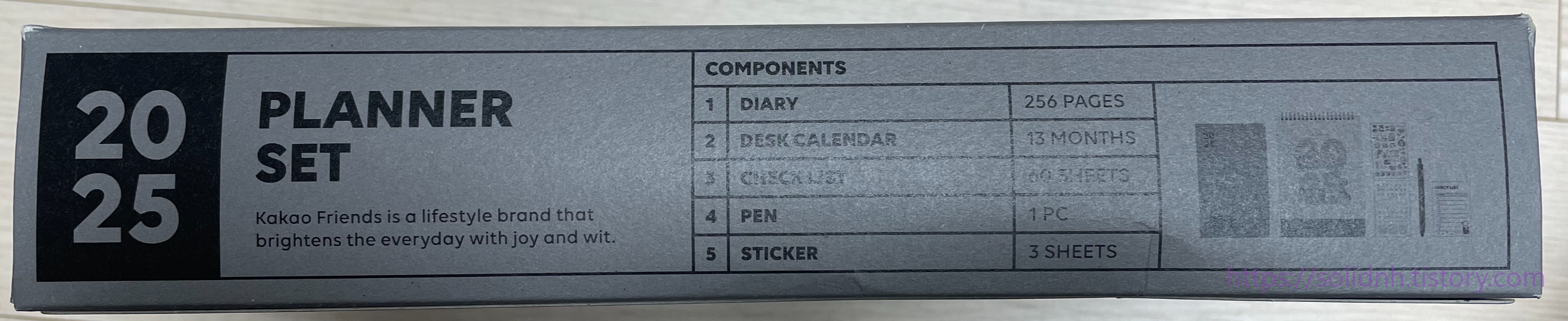 구성품은 다이어리와 달력, 체크리스트, 펜, 스티커입니다.